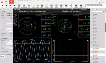 Dijital ölçüm cihazlarını, bir vektörskop, a y/t kayıt cihazını ve 3 boyutlu kontur grafiğini gösteren tipik bir DewesoftX ekranı