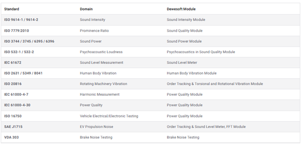 Bunların başlıcaları arasında ISO 9614 (ses yoğunluğu), ISO 3744 (ses gücü), ISO 2631 (insan vücudu titreşimi) ve IEC 61000-4-7 (elektriksel harmonikler) yer almaktadır.